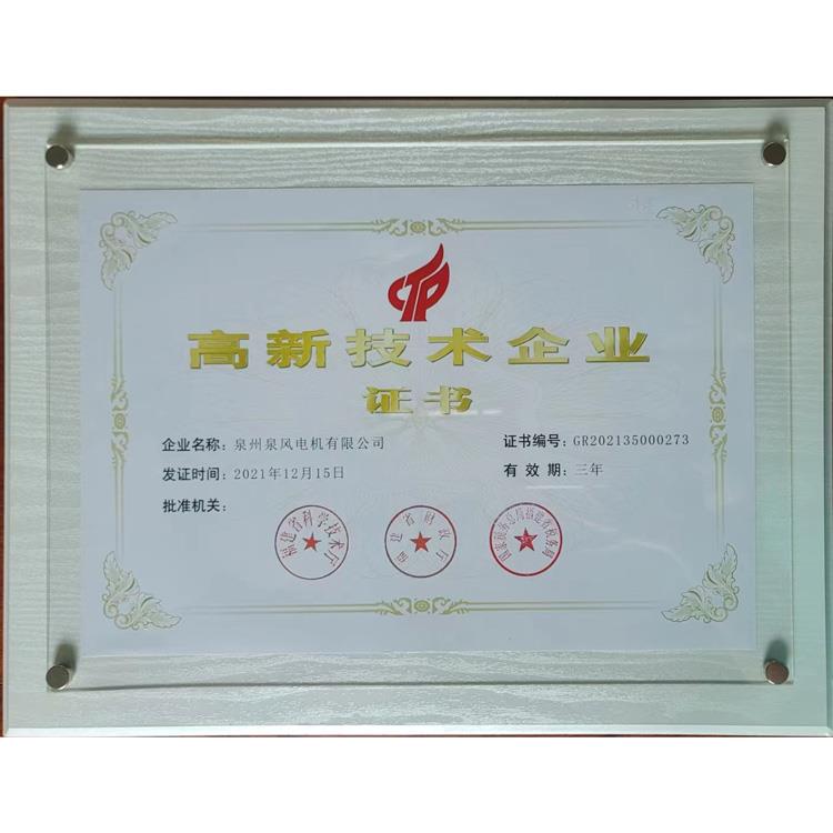 ??公司以建立現代化企業(yè)為目標,堅持“科技是首要生產力”,于2000年通過了ISO9001:2000國際質量體系認證、產品已獲得CCC強制性認證;美國UL、加拿大CUL、歐盟CE等安全認證。并獲得國家微電機產品檢測中心授予“行業(yè)監(jiān)督抽查合格單位”及“九五質量水平優(yōu)秀單位”,“泉風”牌風機被中國技術協會確定為 “風機行業(yè)質量十佳放心品牌”、“中國軸流風機十佳名優(yōu)品牌”?!叭L”牌產品已通過福建省新產品鑒定并獲得“福建省科技成果獎”、“省級優(yōu)秀新產品獎”、“省級科技進步獎”。 2006年度被福建省確認為“福建省高新技術企業(yè)”、“科技進步先進企業(yè)、“福建知名科技企業(yè)”。 “泉風”牌商標被評為“泉州市知名商標”。 2009年“泉風”牌商標被評為“福建省著名商標”。